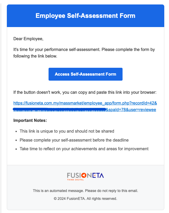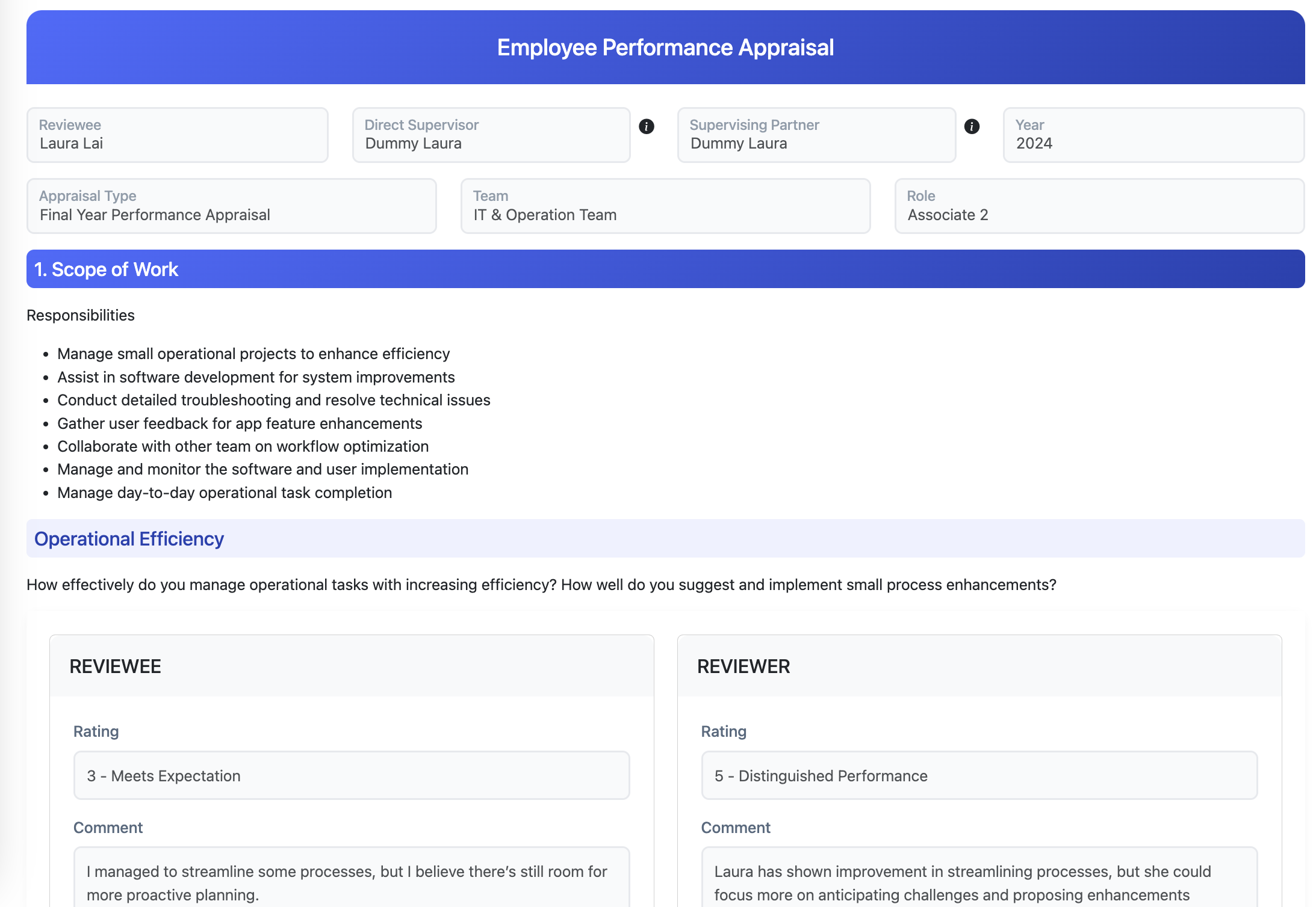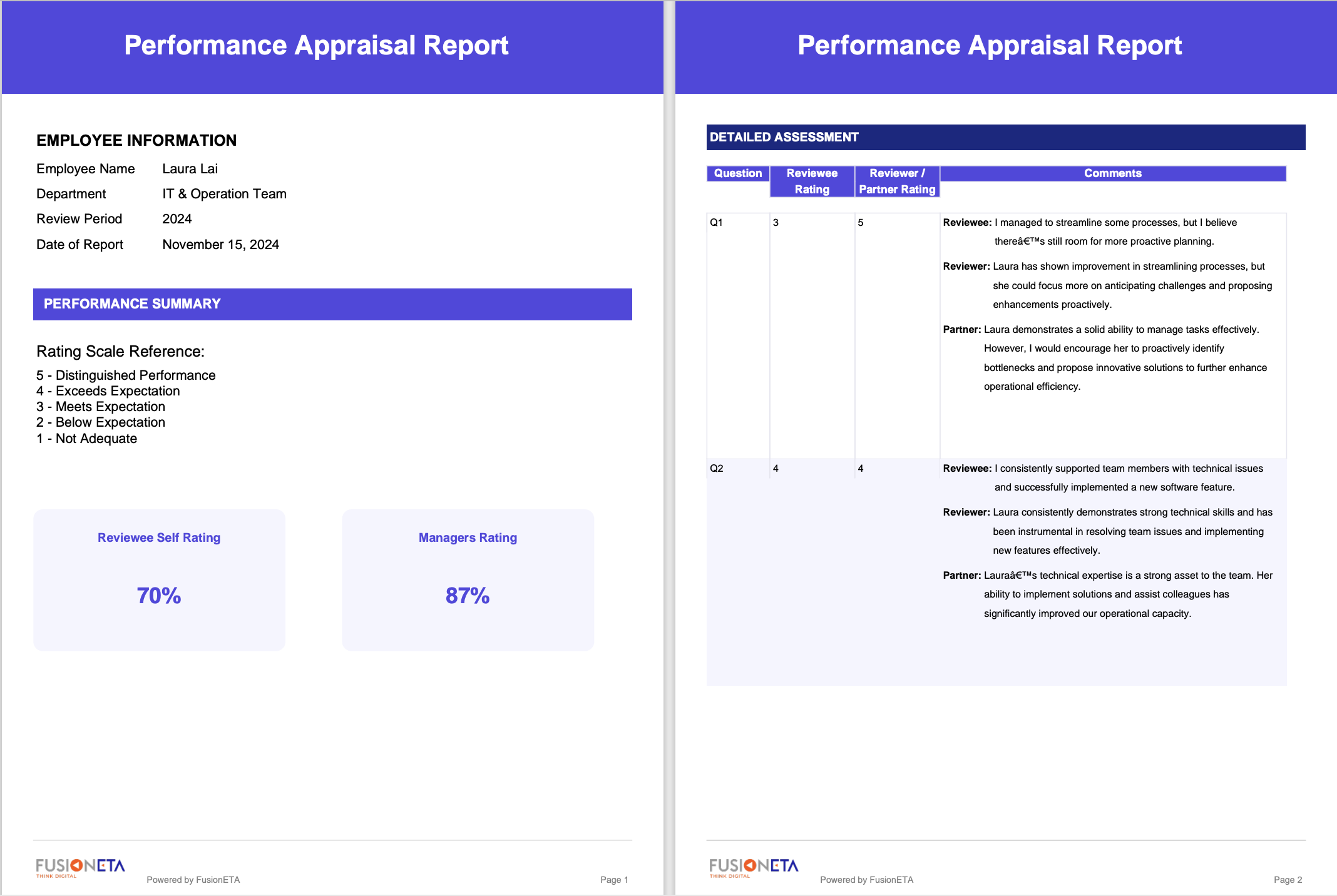 - PDF performance report is generated, shared with all parties and kept in system forever.