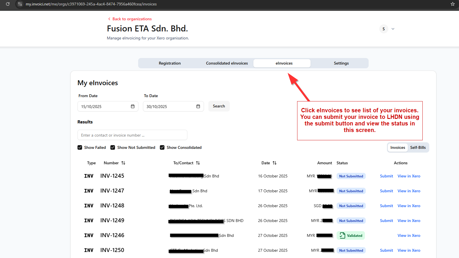 New capability in https://my.invoici.net to allow you to submit invoice to LHDN through a listing view. You can also use this view to track submission status and completeness.